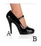 Uma mulher, usando um sapato de salto alto como o mostrado na figura ao lado, caminha pela calçada de um parque. A área de contato do salto com o chão (A) é 300 vezes menor que a área de apoio da planta do pé (B).
