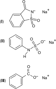 Um refrigerante, de baixa caloria, fabricado no Brasil, tem em sua composição os adoçantes sacarina sódica (I) e ciclamato de sódio (II) e o conservante benzoato de sódio (III).